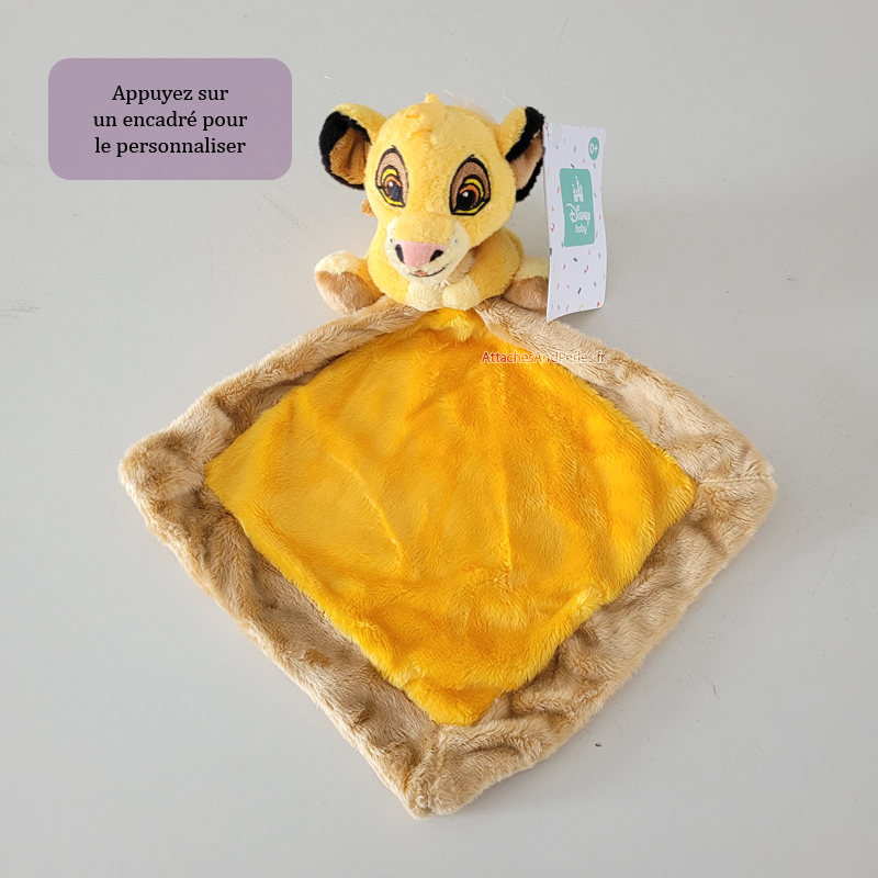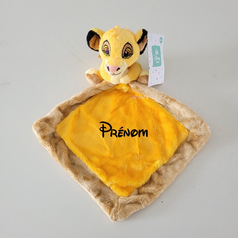 Doudou Simba du Roi Lion à personnaliser avec le prénom de votre choix. Une superbe idée cadeau à offrir pour la naissance de bébé, son nouveau compagnon l'accompagnera dès ses premiers jours.